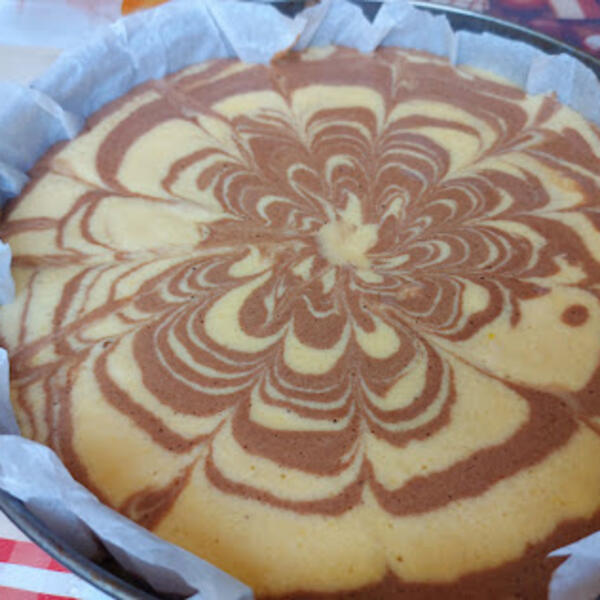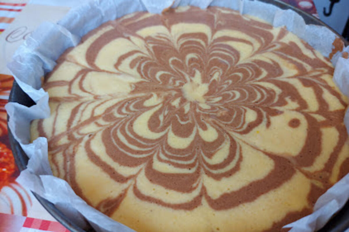 Spremiti 2 jednake kutlače pa sipati testo svetlo na sredinu u njega tamno, svetlo, tamno i tako do kraja. Jednim štapičem razvuči testo od ivice ka sredini i tako u krug.