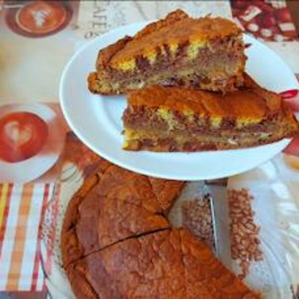 U činiju staviti kakao i dodati 100 ml vrućeg mleka pa izmešati. Testo podeljiti na dva dela pa u jedan sipati kakao.. Pleh 24 cm obložiti pek papirom ili premazati uljem i posuti brašnom.