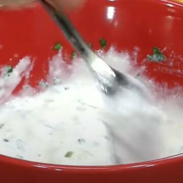 Pripremite sos od belog luka tako što ćete pomešati jogurt sa majonezom, belim lukom (izgnječenim) i peršunom.