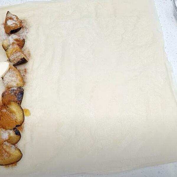 2. Uzmite tri kore. Svaku premazujete sa tri-četiri kašike nadeva, samo na poslednju stavite još i šljive. Pažljivo urolajte i položite na pleh premazan uljem. Ponovite isti postupak s preostalim korama, nadevom i šljivama.