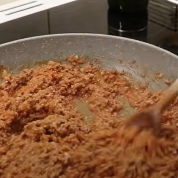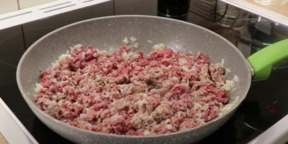 Očistite i iseckajte crni luk, pa ga prodinstajte na malo ulja tako da postane staklast. Potom dodajte meso i paradajz pire, pa nastavite da dinstate dok meso ne pobeli, a paradajz pire se ne ukrčka. Sipajte biber, so i malo biljnog začina, sve dobro izmeštajte i ostavite sa strane da se prohladi.