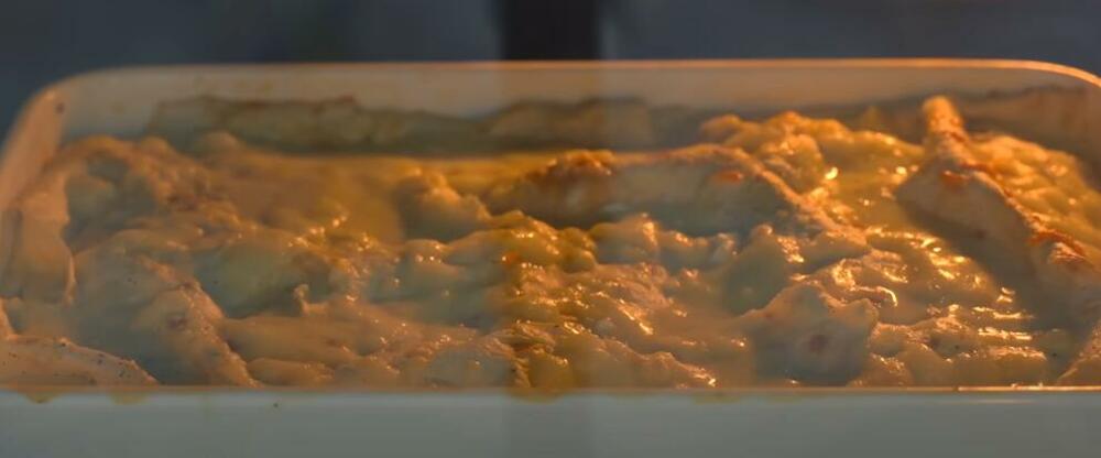 Na vrh stavite malo fila od sira i tako do utroška materijala.. Preostalu mešavinu jaja i mleka sipajte preko. Pecite 20-25 minuta na 180°C.