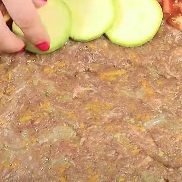 Na malo ulja propržite seckani crni i beli luk (2 čena), pa dodajte rendanu šargarepu. Meso posolite i pobiberite, a zatim dodajte smesu od povrća i sjedinite rukama. U isti tiganj po dnu poređajte meso i lepo utisnite. Po obodu poređajte paradajz isečen na kriške, sledeći red tikvice isečene na kolutove (malo naslonite na paradajz), opet paradajz na kriške, pa tikvice na kolutove. Potrebno je da pokrijete celu površinu mesa.