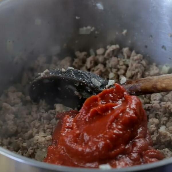 U većoj šerpi, propržiti crni i beli luk. Dodati meso i šargarepe i dobro propržiti. Dodati sos od paradajza, začiniti i kuvati na laganoj vatri oko pola sata.