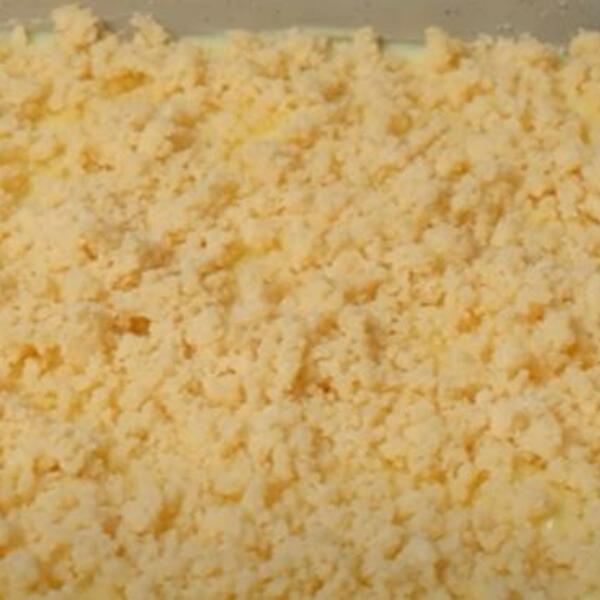 Pleh obložite pek papirom pa sipajte smesu i poravnajte.Jabuke očistite i iseckajte na kockice.