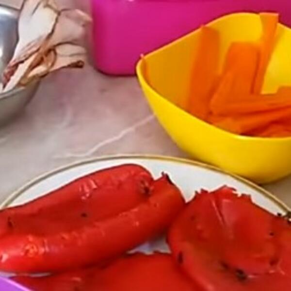 100 gr blitve 2 tikvice 1 kašika brašna 1 kašika prezli 100 gr listića kačkavalja 200 gr pavlake 100 ml. mleka 3 jaja 3 pečene paprike 2 šargarepe tanki listići 100 gr pancerote, suve slanine, so, začin…