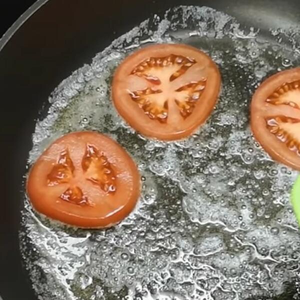Pržiti dok se sa donje strane ne uhvati korica, pa okrenuti, odozgo rasporediti paprike i čajnu, pržiti još minut i poslužiti