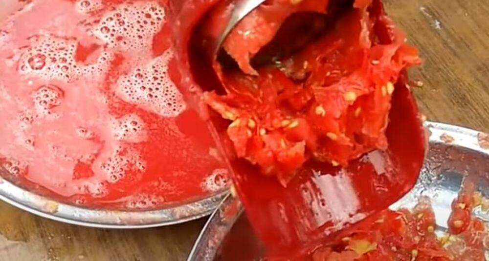 Paradajz dobro oprati. Očistiti i iseći na komade. Samleti mašinicom za mlevenje paradajza. Procediti u specijalnoj cedaljki.