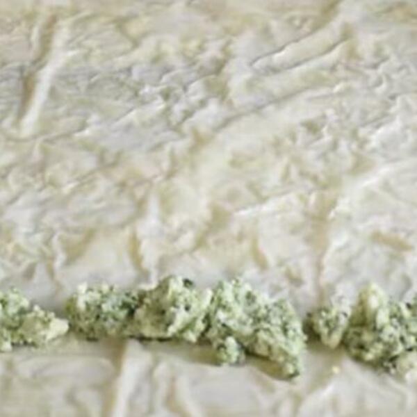 U posudi pomešajte sveži sir, feta sir, jaja, sveži spanać, parmezan, sitno seckani beli luk, so i biber.