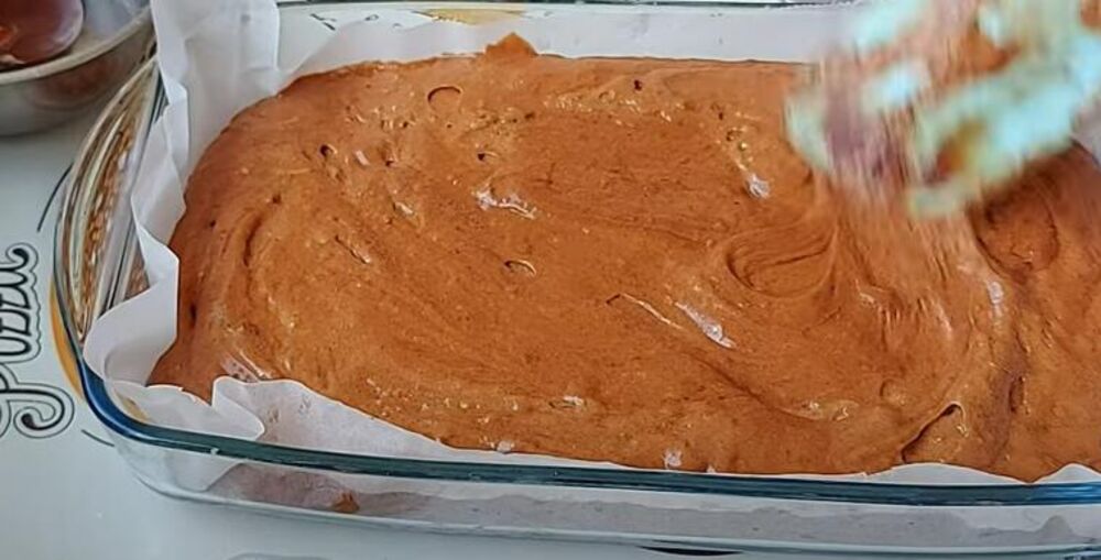 Obložite pleh ili vatrostalnu činiju dimenzija 20×20 cm papirom za pečenje i sipajte smesu u njega.