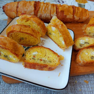 Naseckati stari hleb na kockice i sipati u nauljenu vatrostalnu posudu. Naseckati 100 g kobasice, ali po želji staviti i više i pomesati sa kockicama hleba.. U dubljoj činiji umutiti jaja sa sirom, kajmakom, mlekom, pavlakom, jogurtom, otopljenim maslacem, uljem i dodati prašak za pecivo.