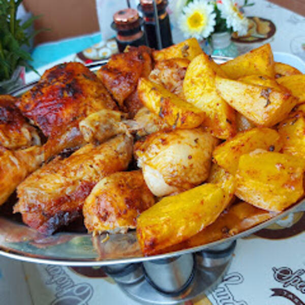 Staviti u tepsiju, pa u rernu ili na roštilj. Dodati krompir u ostatak marinade i peći u rerni na 220 stepeni oko sat vremena.