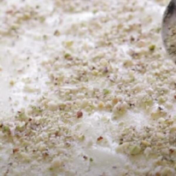 Promešajte i sklonite sa strane. Sitno iseckajte bademe, orahe i pistaće i pomešajte. Puter istopite, pa premažite jednu koru. Preko stavite drugu i opet premažite. Pospite smesom od orašastih plodova. Na sredinu kore stavite dva štapića za ražnjić da se spajaju.