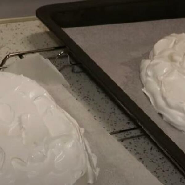 Po završetku pečenja otvoriti širom rernu i ostaviti koru još 15 minuta unutra. Izvaditi pleh i ostaviti koru da se skroz ohladi. Ohlađenu koru pažljivo preneti na tacnu, preko rasporediti slatku pavlaku koja je umućena sa kašikom šećera.