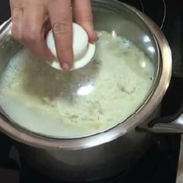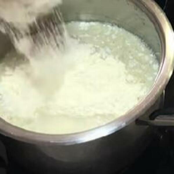 Sada drvenom varjačom dobro "istucite" masu da se potpuno sjedine krompir i brašno. Potom sklonite sa ringle na par minuta. U drugu šerpicu sipajte mleko, dodajte kajmak i pavlaku pa uključite ringlu da se sve istopi i sjedini. U to stavite kačamak, promešajte i sačekajte da provri. Sklonite sa ringle i servirajte. Ukupno vreme kuvanja kačamaka treba da bude oko 40 minuta.
