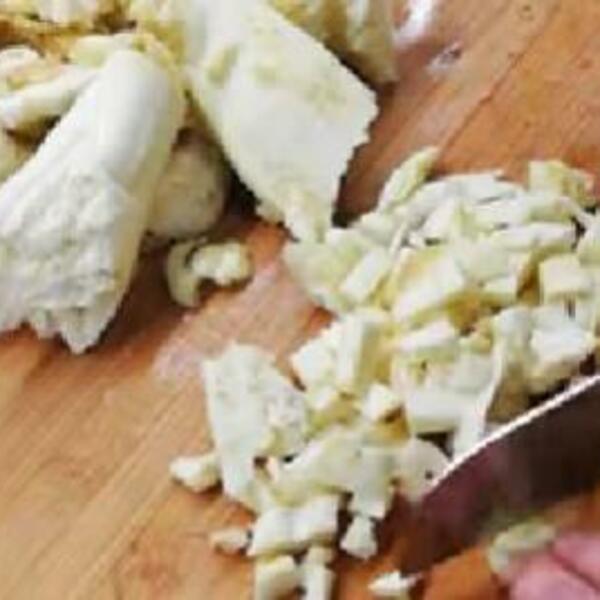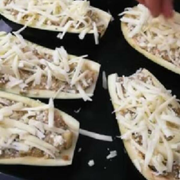 Plave patlidžane preseći uzduž na dva dela, izdubiti ih na debljinu od 0,5 cm (sredinu ostaviti za fil). Posoliti ih i ostaviti 15-20 minuta da odstoje i puste crni sok. Isprati ih pod mlazom vode, osušiti kuhinjskom krpom.