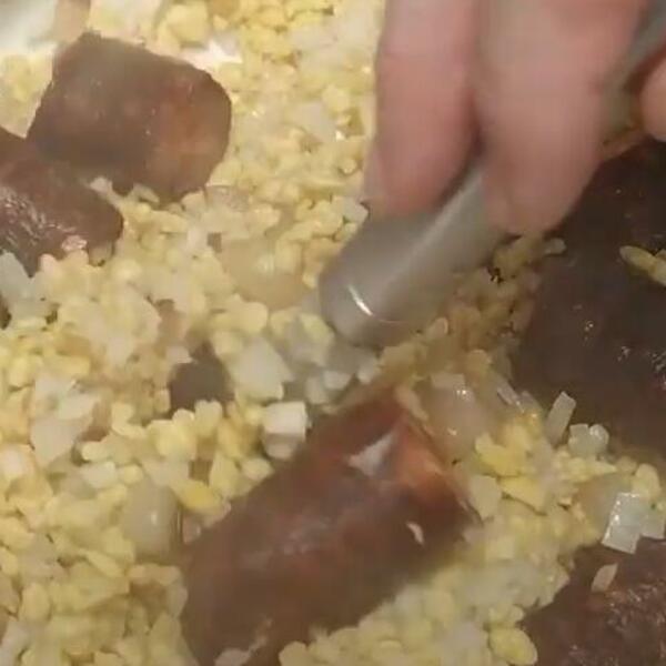 Sitno iseckan luk dinstati na malo ulja. Kad postane staklast, dodati isečen krompir i kobasicu isečenu na tanke kolutove i zajedno dinstati uz neprestano mešanje kako kobasica ne bi izgorela.
