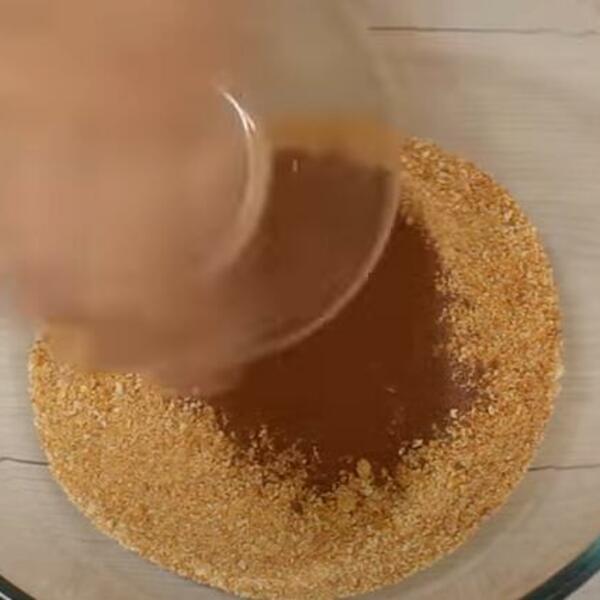 Pomešajte mleveni keks sa bademima i rastopljenim puterom, pa sjedinite da dobijete kompaktnu smesu.