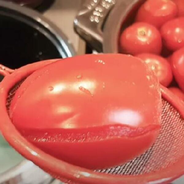 Paradajz ( čeri veći ili običan sitniji) oprati pa zaseći vrhove u obliku krstića. U šerpu sipati vodu pa kad proključa spustiti paradajz koliko stane. Pustiti da vri minut pa vaditi u hladnu vodu. Skinuti ljuskicu i udstraniti dršku oštrim nožem u dubinu.