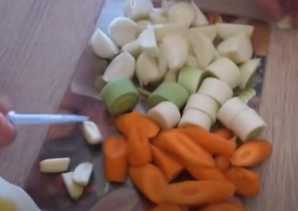 Crni luk sitno iseckajte, pa ispržite na ulju da se zastakli. Nakon toga dodajte i meso isečeno na kockice (ostavite i masnije delove) i sitno naseckan beli luk. Dok se meso krčka pripremite povrće. Krompir oljuštite i isecite na četvrtine, šargarepu, celer i paškanat na kolutove, kupus i papriku isecite na krupnije komade.