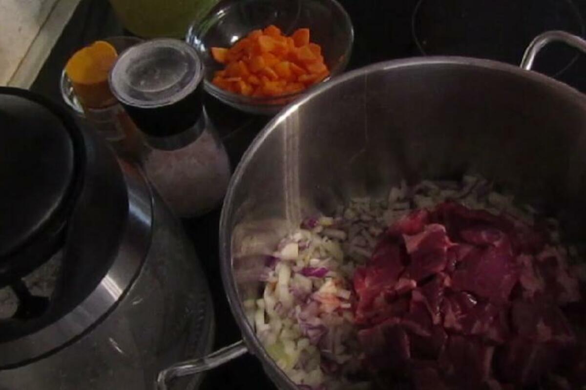 Dinstajte ga dok ne dobijete želatin, tj. gustu masu. Iseckajte junetinu na kockice (2,5x2,5cm) i dodajte je u izdinstani luk, zatim nalijte vode toliko da prekrije meso.