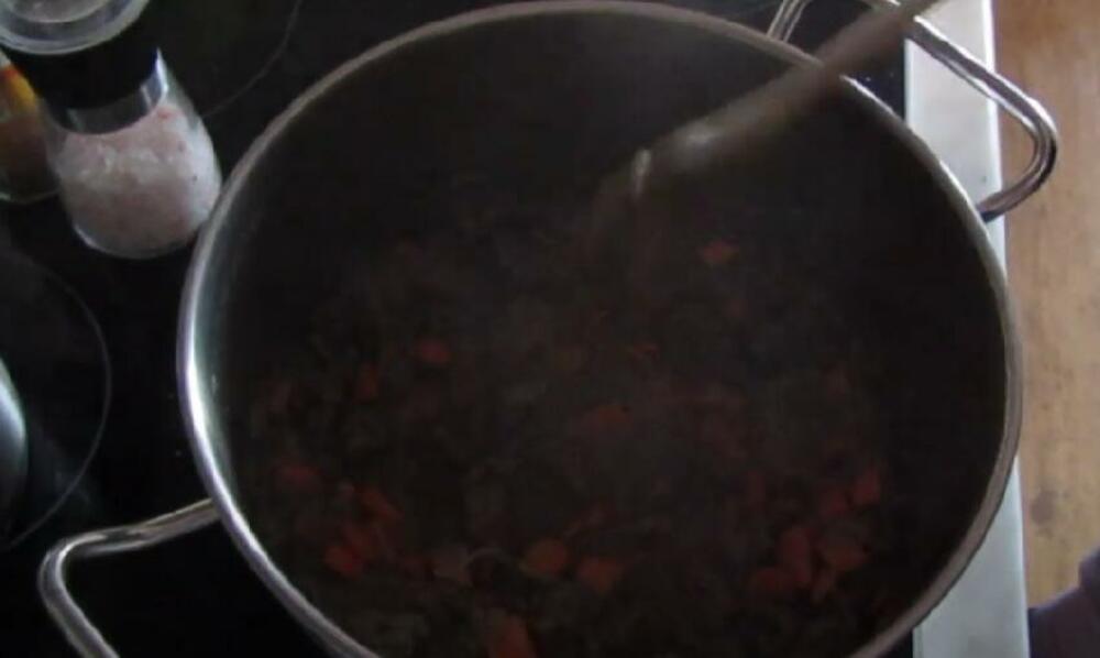 U veću šerpu dodajte ulje, kada se malo zagreje, dodajte crni luk koji ste prethodno isekli na kockice, a zatim beli luk da se sjedini.