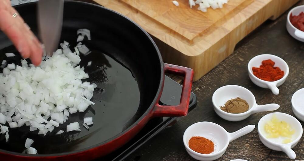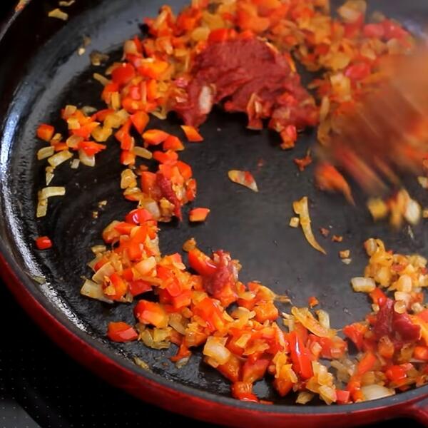 Na zagrejanom maslinovom ulju propržite crni luk, pa dodajte i beli. Dodajte crvenu papriku i nastavite da dinstate dok ne omekša. Umešajte paradajz pastu i paradajz isečen na kockice, dodajte sve začine i šećer. Začinite solju i biberom i ostavite da se krčka na srednjoj vatri 10-15 minuta Razbijte jaja preko smese od paradajza, jedno u sredini i 5 oko ivica tiganja. Pokrijte tiganj i dinstajte 10-15 minuta, ili dok se jaja ne skuvaju.