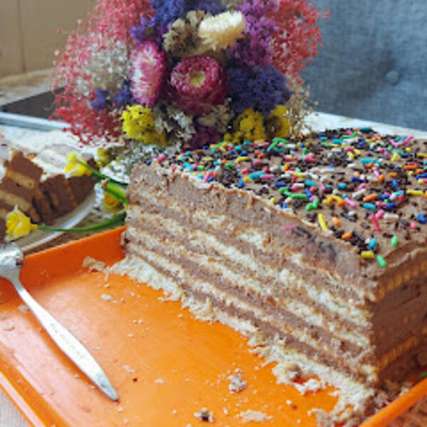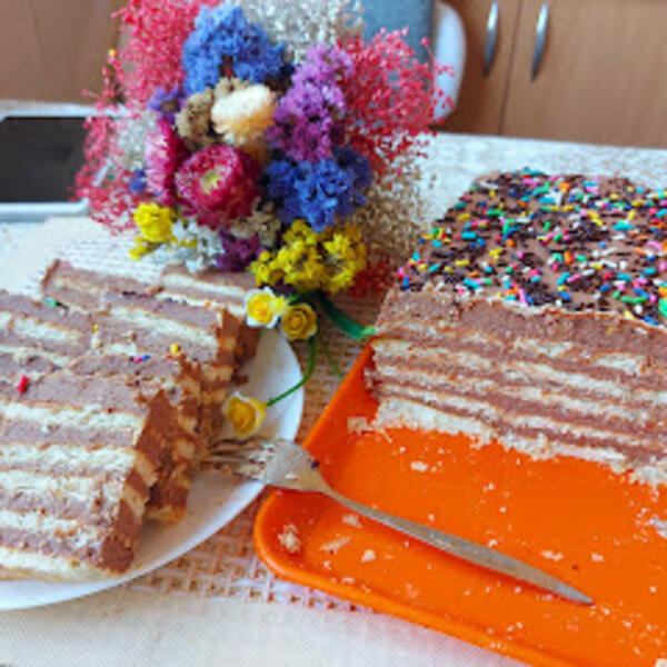Ostaviti u frižideru da se dobro ohladi i upije. To je torta moga detinjstva i uvek je sa radošću spremama.