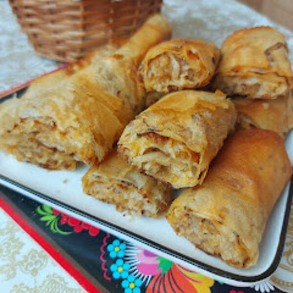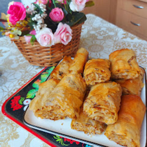 Redjati u podmazan pleh. Sve do utroška materijala.. Iseći malo nožem na rolate pa peći na 200 stepeni C oko 35-40 minuta.
