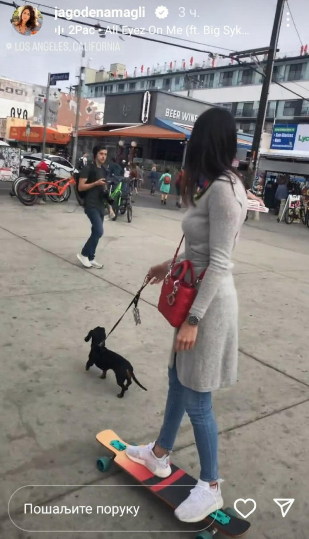 Da joj osim glume, i sport ide odlično, osim fudbala, pokazala je kratkom video objavom na kojoj uspešno i kao pravi profesionalac vozi skejt dok šeta njihovog ljubimca, psa Ljubicu koja joj uvek pravi društvo. Njih dve zajedno idu u šetnju, Ljubica je tu dok glumica vežba sa trenerom na terasi, kako bi održavala svoju vitku figuru, kojom je ovog leta oduševila sve prisutne, kako na plaži, tako i na društvenim mrežama. Pokazavši zategnut i izvajan stomak samo nekoliko meseci nakon porođaja.