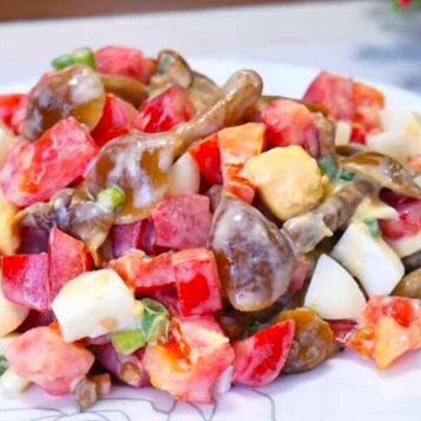 Paradajz salata: prelivena maslinovim uljem,peršunom i belim lukom.