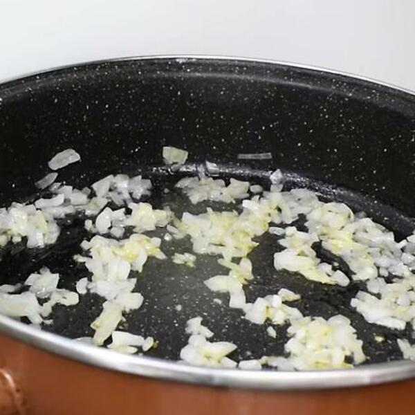 U dublji zagrejan tiganj sipajte malo ulja, pa dodajte sitno seckan crni luk i pečurke. Kada luk postane staklast, dodajte i pirinač.
