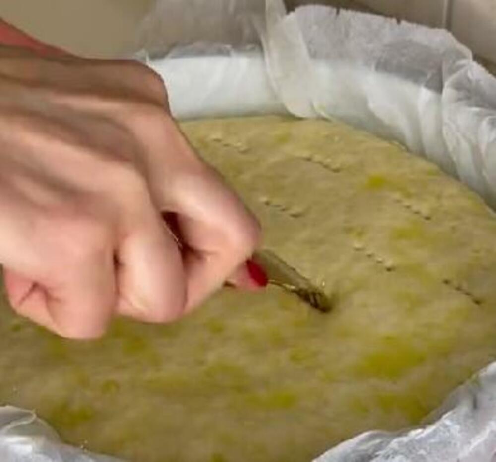 Tepsiju možete nauljiti, a možete i staviti pek papir. Zatim testo prebacite u tepsiju i rukama ga rastanjite. Premažite uljem i izbockajte viljuškom. Ostavite par minuta da nadođe, ako ga stavljate u zagrejanu rernu. A ako stavljate u hladnu rernu, možete je staviti odmah, narašće dok se rerna polako zagreva.