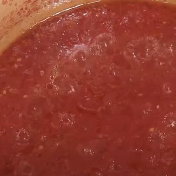 3 U paradajz dodajte so, šećer, sirće i ulje, pa dobro promešajte. Kad sve provri, dodajte biber, peršun, celer i paprike, i ostavite da tiho vri 10 minuta uz povremeno mešanje.