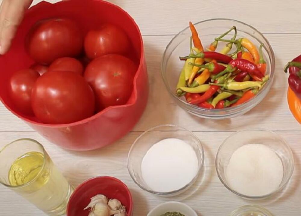 200 g šećera 6 dl sirćeta 3 dl ulja 20 zrna bibera 1 kašičica mlevenog bibera 1 konzervans Priprema 1 Paradajz poparite i oljuštite, pa isecite na kockice i stavite u lonac da se zagreva.