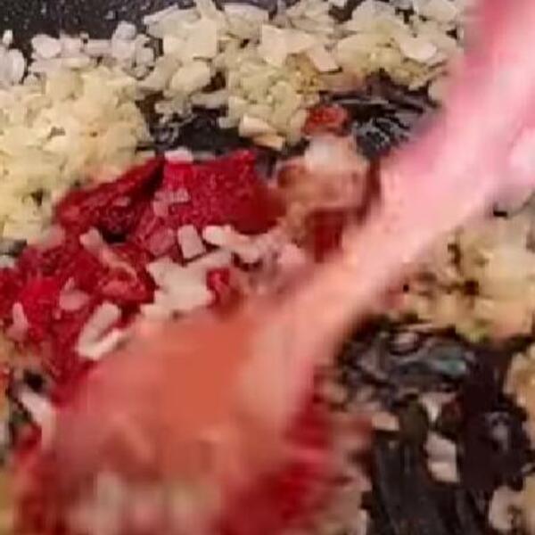 Priprema: Na maslinovom ulju propržite sitno seckan crni luk dok ne omekša. Zatim dodajte obe paradajz paste i promešajte. Pospite slatkom paprikom i peršunom, pa promešajte i ostavite da se krčka par minuta. Dodajte pirinač koji ste oprali i procedili i dobro promešajte, a zatim dodajte i sitno seckani beli luk. Dodajte seckani paradajz, promešajte i posle 5 minuta sipajte vodu.