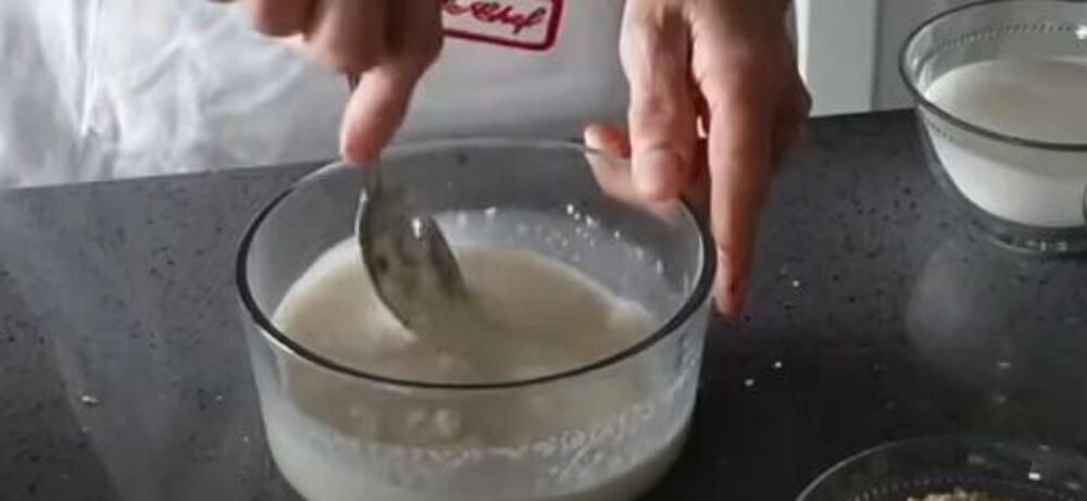 Pomešajte brašno, griz, orahe i cimet. U drugoj posudi umutite jaja sa šećerom. Dodajte ulje, sjedinite, pa mleko i ponovo umutite.