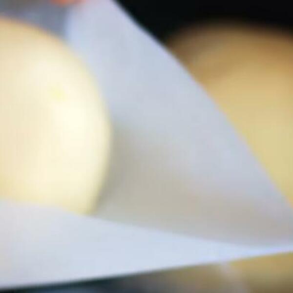 Postepeno dodavati brašno i umesiti testo. Ostaviti ga 10 min da odmori, pa ga istanjiti oklagijom na 1 cm debljine i preliti sa 1-2 kašike vruće vode, preklopiti sa svih strana da se dobro zatvori da voda ne iscuri, prevrnuti i ostaviti da stoji 15 min.