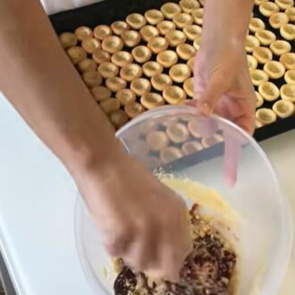 Testo izvadite iz frižidera, stavite ga na pobrašnjenu radnu površinu i isecite te ga na dva jednaka dela i napravite dve rolnice, a rolnice iseckajte na manje komadiće.