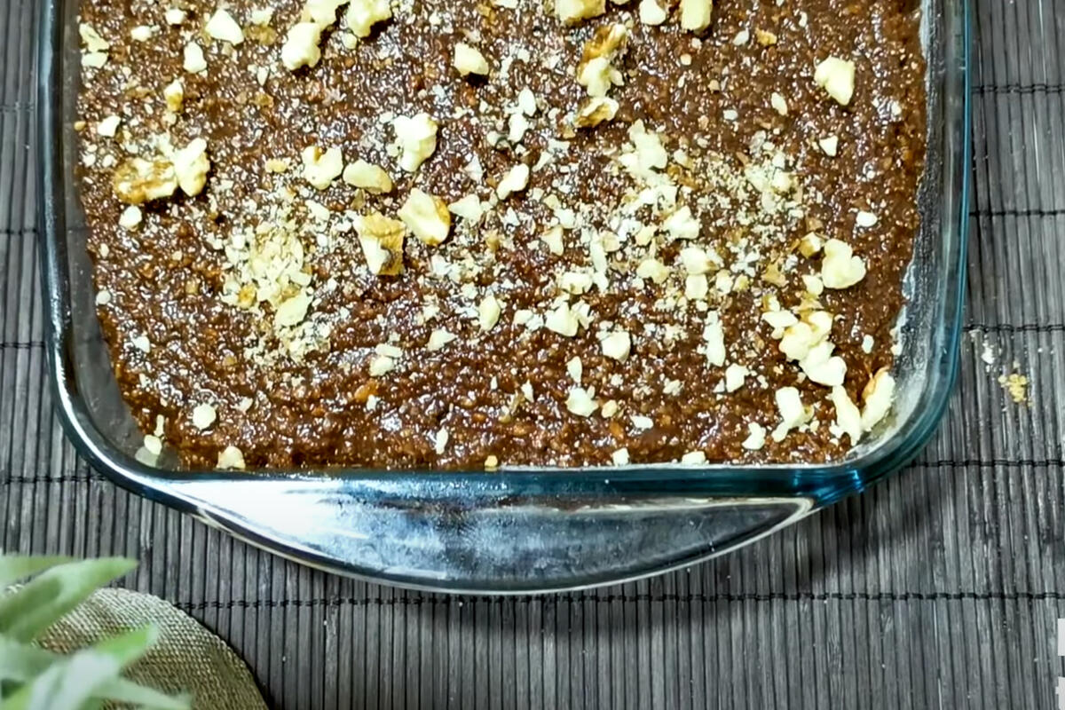 Priprema: Dobro umutite jaja i šećer. Postepeno dodajte šećer. Dodajte vanilin šećer, mleko i ulje. Dodajte brašno i prašak za pecivo. Promešajte ručno i stavite mlevene orahe.