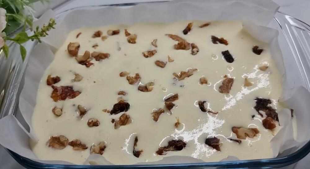 Zatim iseckajte orahe i urme na sitne komadiće, pa pospite, a na kraju pospite seckane bademe. Pecite kolač na 180 stepeni oko 20 minuta. Po želji, nakon pečenja ga možete preliti karamel sirupom.