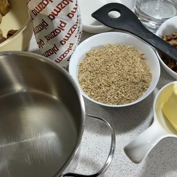 Vodu, šećer i vanilin šećer staviti da se kuva, pa kad provri da se sve otopi staviti mevene orahe i mleveni keks, malo ruma i limunove korice ( vanilin šećer, limunova korica i rum nisu u original receptu ali ja ne bih bila ja kad ne bi malo stavila, a vi kako želite )