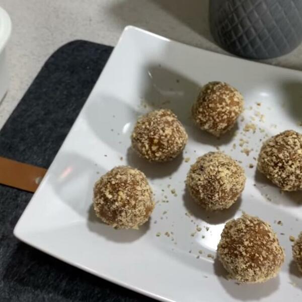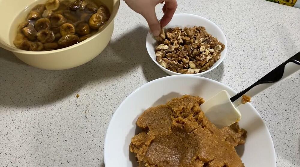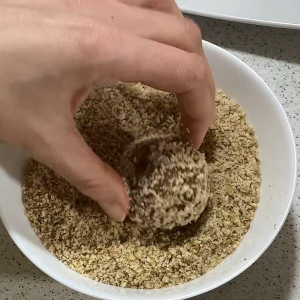Smesa od oraha i keksa je dosta lepljiva, pa na ruke stavite malo mljevenih badema ili oraha ili ruke sa jako malo ulja izmedju dlanova utrljajte.