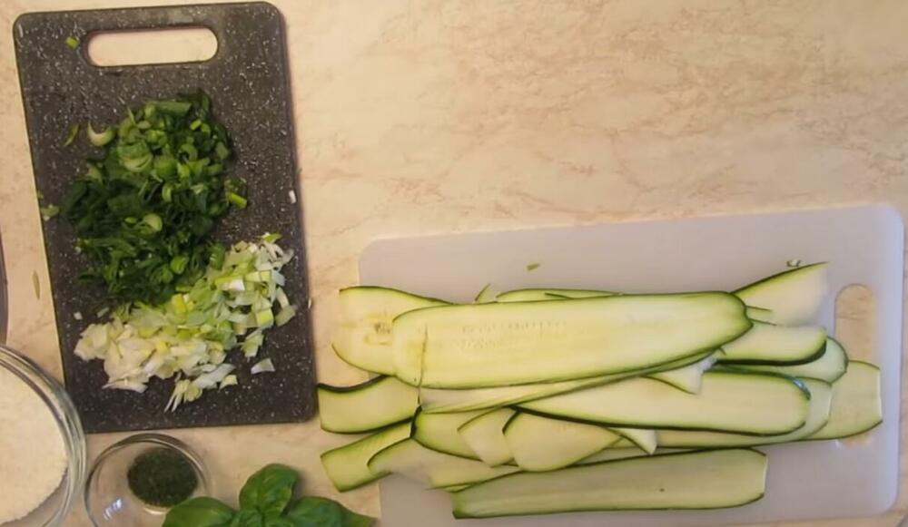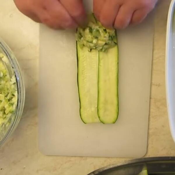 Tikvice isecite po dužini, stavite na tanjir, pa posolite. Ostavite da odstoje nekih 15 minuta. Za to vreme pomešajte krem sir, sekcani peršun i mleveni beli luk, pa promešajte. T