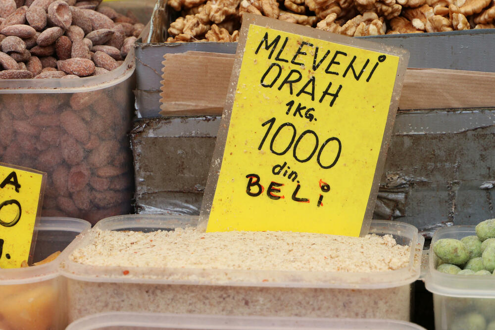 Od belanca napraviti čvrst sneg i postepeno dodavati šećer pomešan sa vanilinim šećerom i na kraju lagano umešati orahe