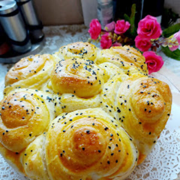Pokriti i ostaviti 30 minuta da odmara. Mast izmutiti da bude penasta i da pobeli. Kad testo naraste razviti ga u pravougaonik, premazati mašću pa preklopiti kao za lisnato testo. Odmoriti oko 15 minuta. Tako uraditi 4 puta a zatim preklopljeno testo staviti u podmazanu tepsiju veličine 24 centimetara.