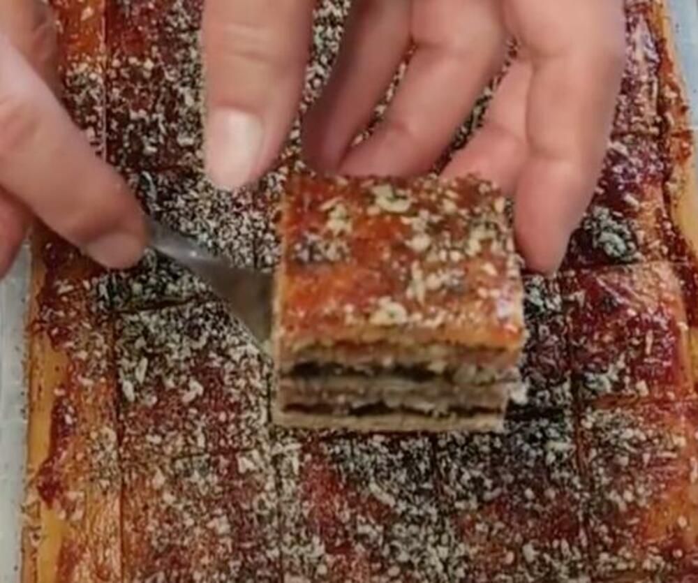 U posudi pomešajte orahe i šećer i podelite na 4 jednaka dela. Razvucite testo dimenzija 20x30 cm, pa ga stavite u nauljen pleh istih dimenzija. Premažite koru džemom, pa pospite šećerom i orasima. Preko stavite sledeću koru, pa opet premažite džemom i pospite orasima i šećerom.