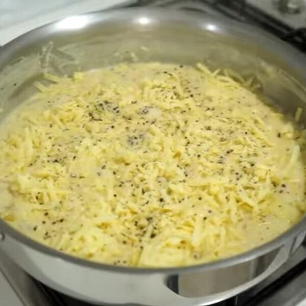 Kuvajte dok se sos malo ne zgusne, pa dodajte pola količine rendanog sira. Promešajte da se otopi, pa pobiberite. Pospite preostali rendani sir, ali ovaj put ne mešajte. Pecite u zagrejanoj rerni na 180°C oko 8-10 minuta.