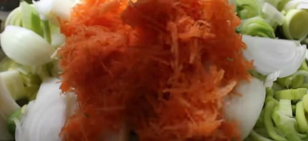 U međuvremenu crni luk iseći na rebarca, pa pržiti u ulju na umerenoj vatri dok ne omekša. Začiniti mlevenom paprikom, posoliti i pobiberiti, mešati još minut, pa skloniti sa ringle.