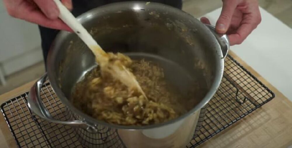 Dobro promešajte i sipajte u posudu, pa dodajte limunov sok i opet promešajte. U istoj šerpi (nemojte da perete) na maslonovom ulju propržite rendani crni luk i celer. Zatim dodajte opran pirinač i kuvajte 5 minuta, uz neprestano mešanje.